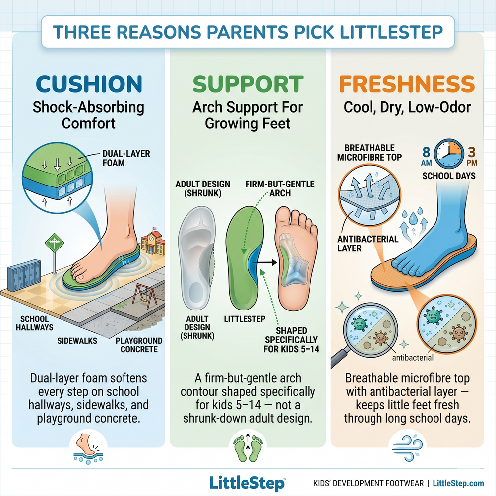 LittleStep replaces it with real support: a contoured arch for kids 5–14, a deep heel cradle for stability, and dual-layer EVA/PU cushioning for softer steps on hard surfaces.