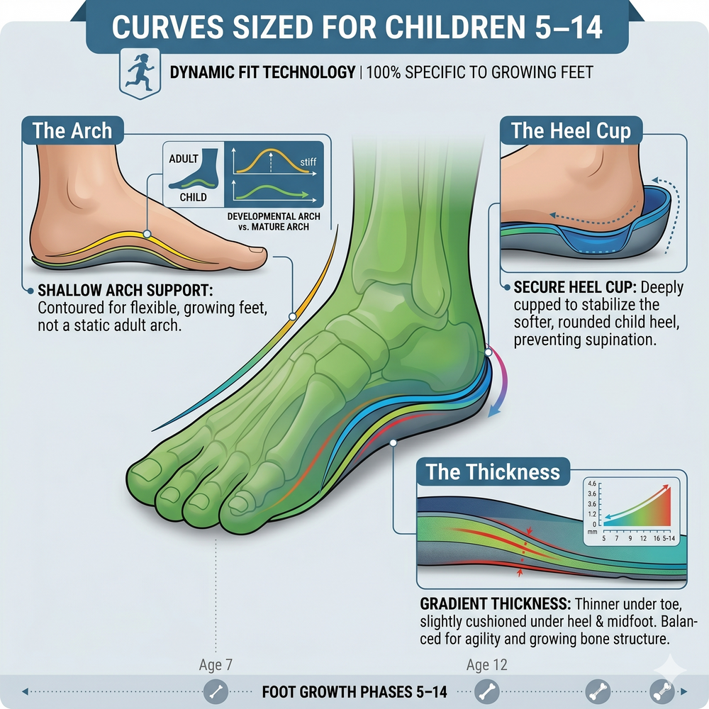 Every curve — the arch, the heel cup, the thickness — is sized for children 5–14, not a smaller version of an adult insole.
